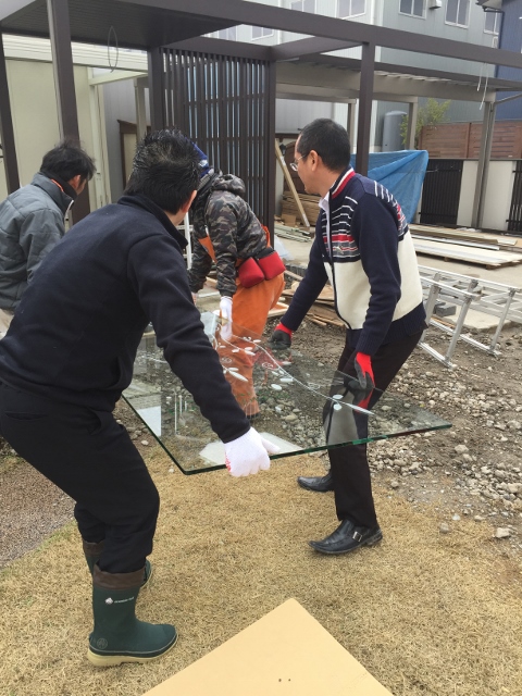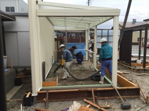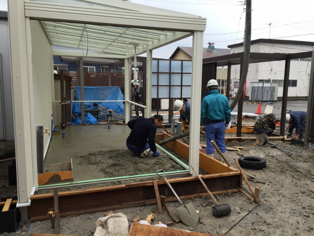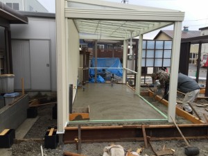 リクシルの暖蘭物語(サンルーム)の枠が完成し、タイルテラスを貼るための