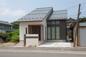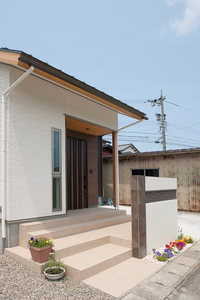 玄関から2段降りて踊り場があり、その前にモニュメントを設置。