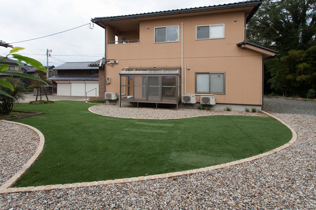 2014/09/11あわら市 T様邸 人工芝 庭工事 ピンコロ花壇 リフォームガーデン 福井市 こんにちはリバーフォレストのマダヨです。 今日は先週のT様邸の完成写真をご紹介します。 まずはサンルーム側から。 樹木がたくさん植えてあってちょっとお手入れに手間がかかっていましたが、 人工芝ですっきりした見た目に。 玄関側から見るとこんな感じ。 もともと有ったピンコロサークルを残しました。 全てを人工芝にせず、ピンコロで仕切り南条砂利や花壇に。 アールで区切られたそれぞれがバランスよくデザインされています。