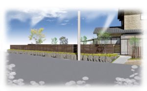背の高い生け垣は全て撤去し、木調フェンス+低木のご提案です。