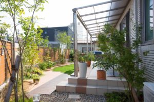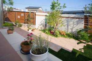 タイルテラスの前は人工芝と300角タイルで温かみのある景観に。