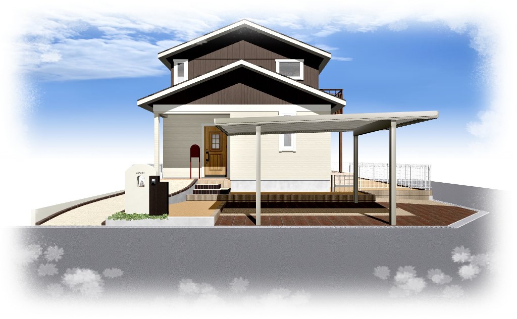 カラーコンクリート マットスタンプ スロープ ポスト 塗り壁モニュメント ウィンスリーポートⅡ メッシュフェンス 芝生 タイルテラス わんちゃん 坂井市 新築外構