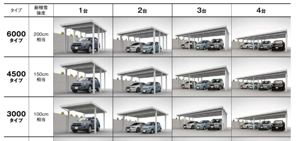 カーポートにも、いろいろ種類があり、耐積雪量でタイプを選ぶことか出来ます。