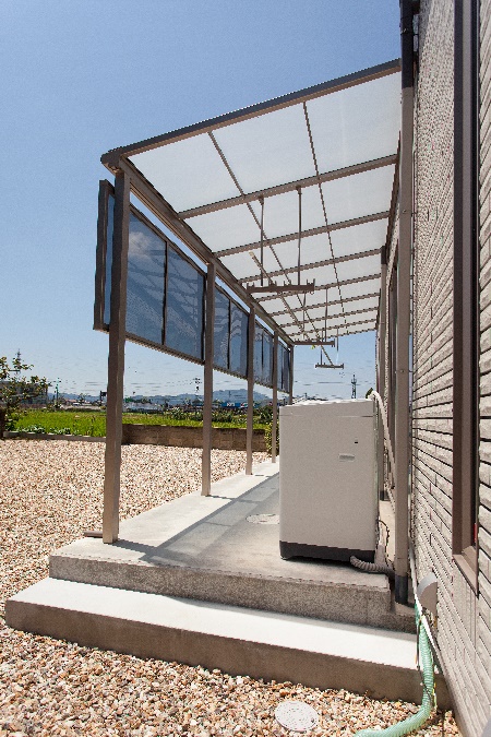 2世帯家族分のお洗濯物干場なので、テラス屋根を連結させて4間分の間口があります(^^♪