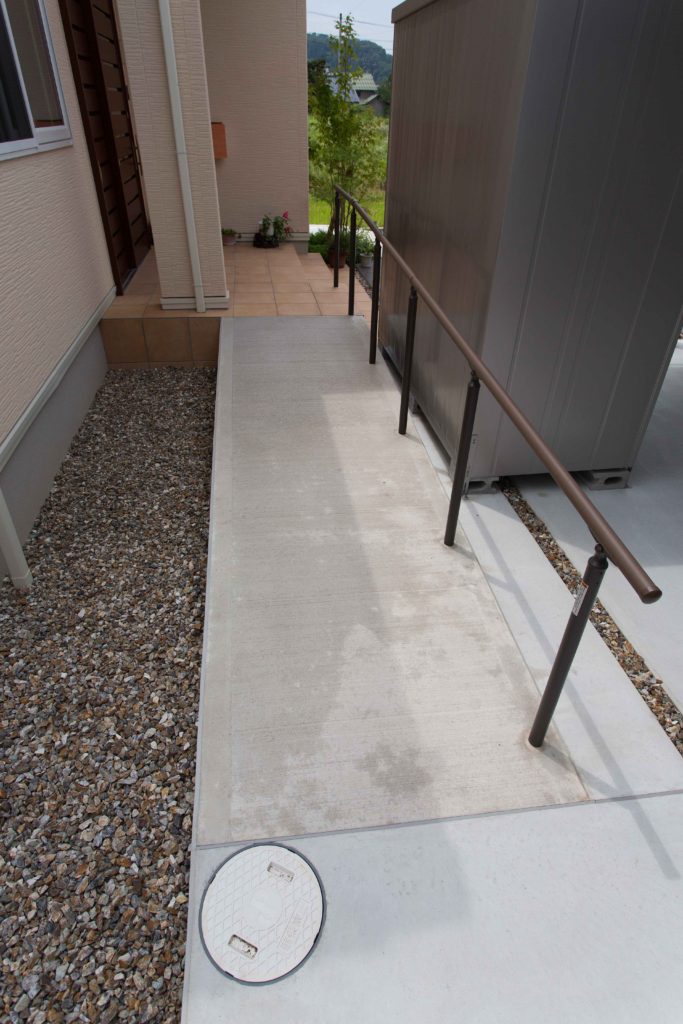 アプローチもゆるやかな曲線を描いていてヒトにやさしい印象を与える外構になりました。