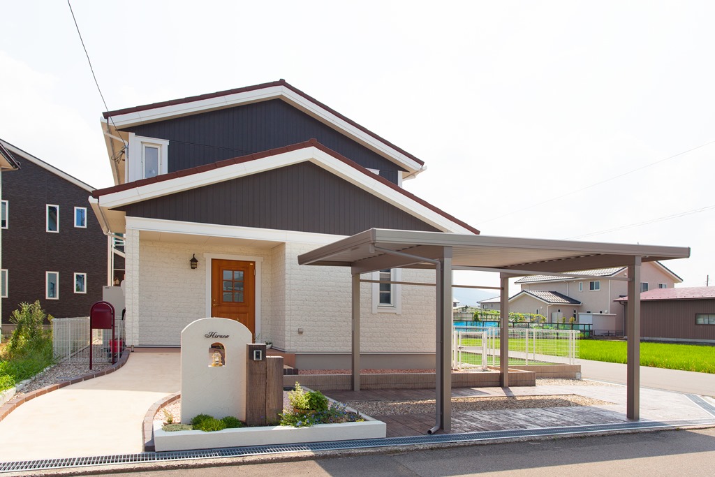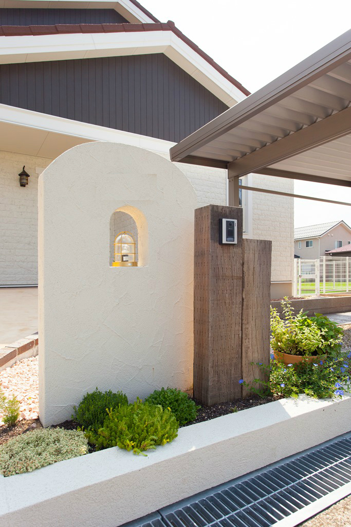 スロープ ポスト 塗り壁モニュメント カラーコンクリート マットスタンプ ウィンスリーポートⅡ メッシュフェンス 芝生 タイルテラス わんちゃん 新築外構