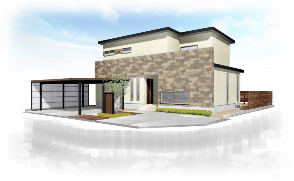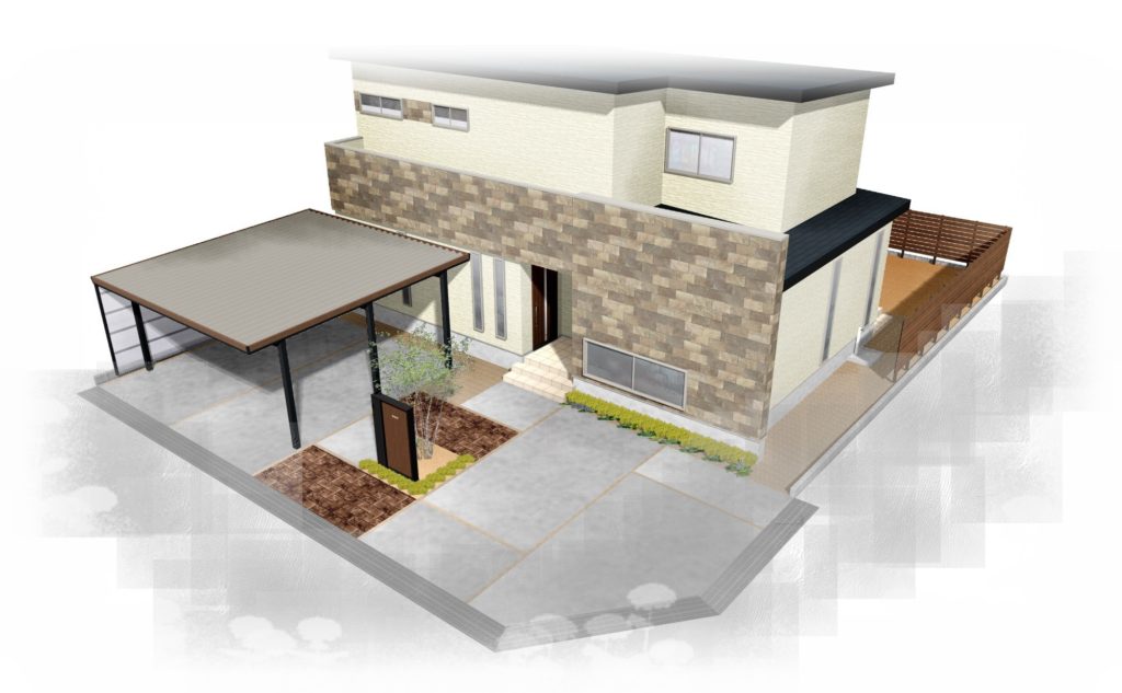主な内容は化粧板を使った鼻隠しのカーポートに茶色のスタンプコンクリート、機能性門柱、植栽、ウッドフェンス、人工芝、南条砂利ですね。