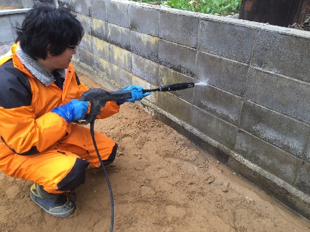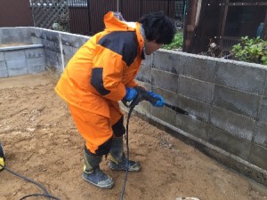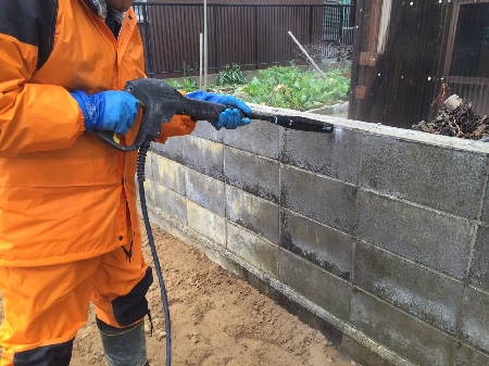 2016/06/02ブロック 高圧洗浄 塗り壁 リバーフォレストのYYです。 今回は既存のブロックに塗り壁を施す為に高圧洗浄でブロックの汚れや藻を落とす作業の紹介です。 高圧洗浄をはじめます。 上から下に向かって丁寧におこないます。 特に汚れや藻のひどい箇所は念入りに洗浄します。 特に藻が付着していると塗り壁の作業の時に作業がやりにくくなる為です。 写真のブロックの右側が高圧洗浄後の写真です。 このように汚れや藻を落としていきます。 ブロック 高圧洗浄 塗り壁