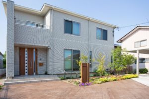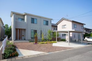 建物、スタンプコンクリート、エクステリアがトータルコーディネートされています。