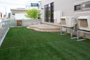 周りは人工芝を敷き詰め、お手入れ要らずの快適なお庭に。
