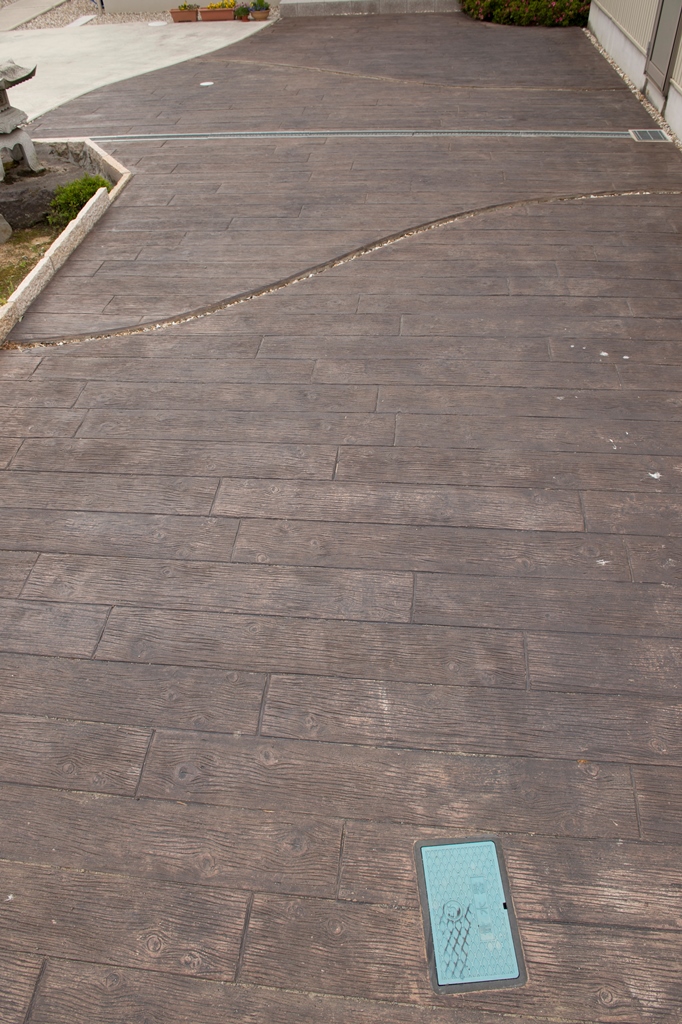 自然石の花壇とビンテージウッド柄のマットスタンプで