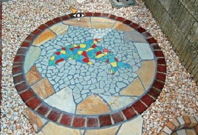 こちらはサークルの中に、天然石の石張りと、このクラッシュタイルを使用しています。