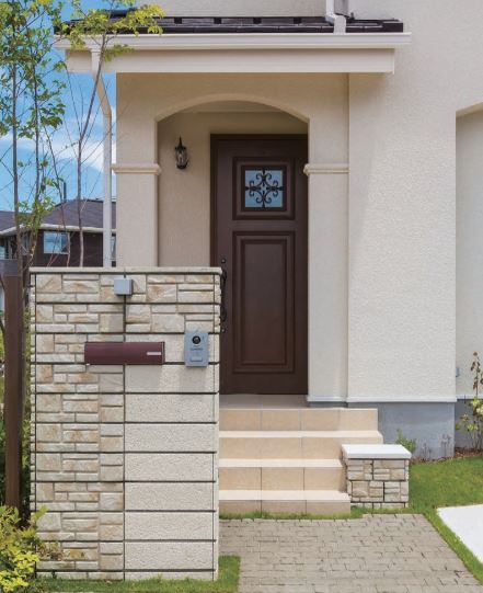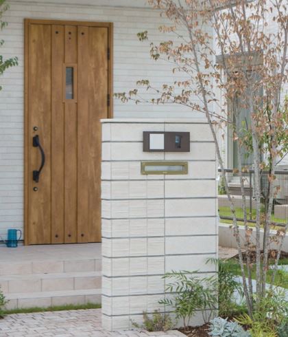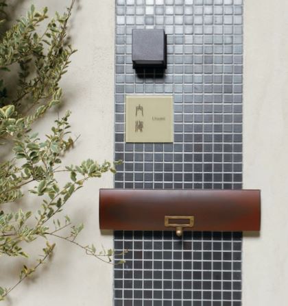 📪 投稿口を覆ったカバータイプの「ムント」と投函蓋に木目調をあしらった「サスウッディ」は、シックな表情のエントランスに。