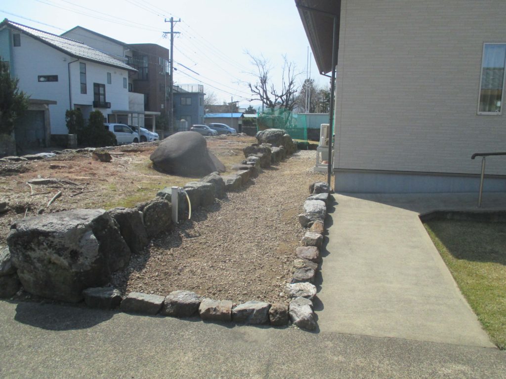 境界側以外の石垣を大胆に撤去し、化粧ブロックとフェンスで有効スペースを広くとりました。