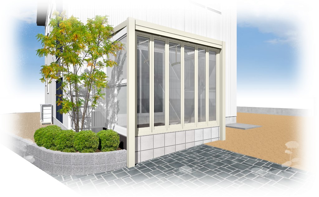 掃出し窓の前のタイルテラスにガーデンルームを付けて多目的スペースに。