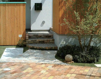 敷材としてはもちろん、階段や花壇にヴィンテージレンガをふんだんに使って