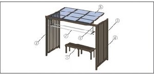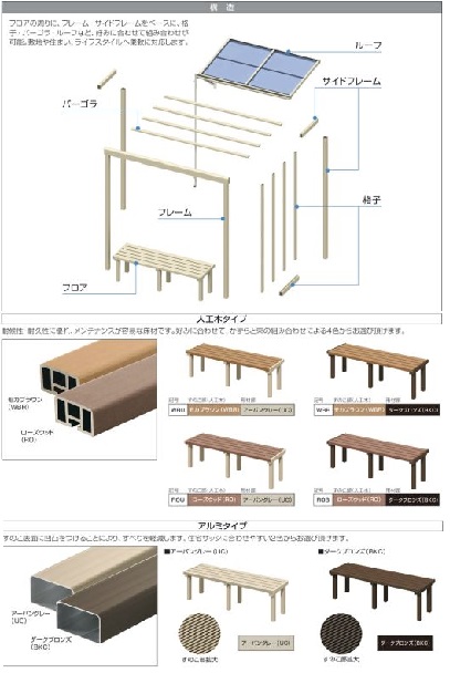 フロアの周りに、フレーム・サイドフレームベースに、格子・パーゴラ・ルーフなど好みに合わせて組み合わせが可能。