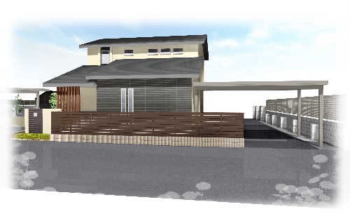 敷地の左右に、3台用と2台用の折板カーポートを設置。