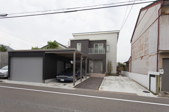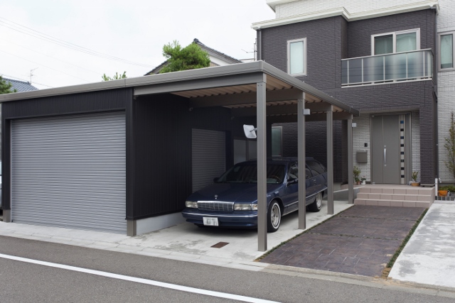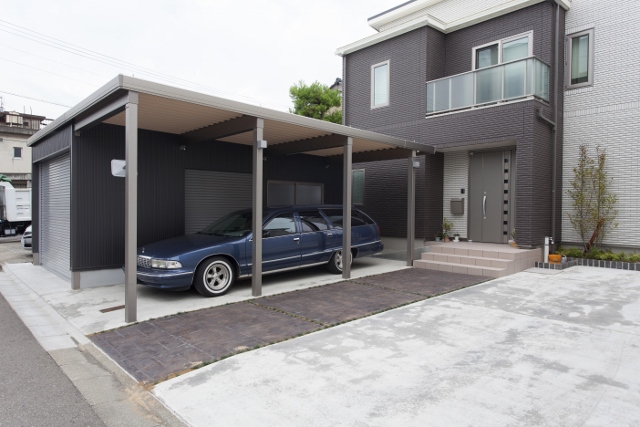 LIXILのウィンスリーポートⅡに黒のガルバリウムを囲ったガレージが建物によく合って素敵ですね(^-^)