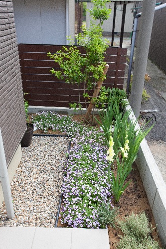 玄関ポーチ横には、境界ブロックで区切って土を入れて、こちらも花壇スペースに♪