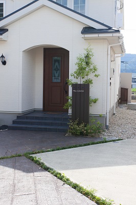 玄関扉の木彫色と、モニュメント、マットスタンプの色合いがばっちりです😄