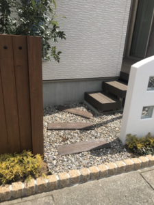そのウッドデッキにつながる動線には擬木の飛び石が