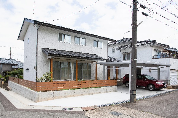 新築外構 木彫 フェンス おしゃれな 人工芝 アプローチ