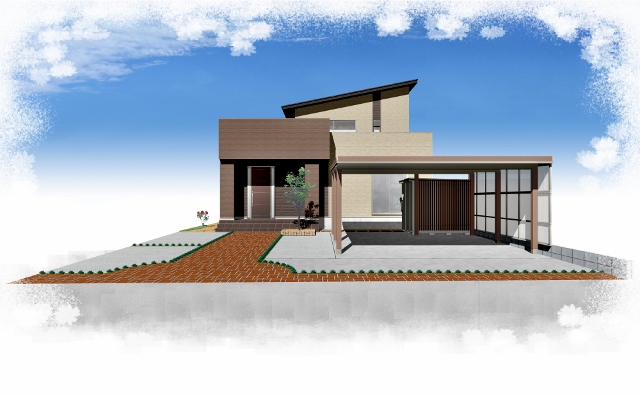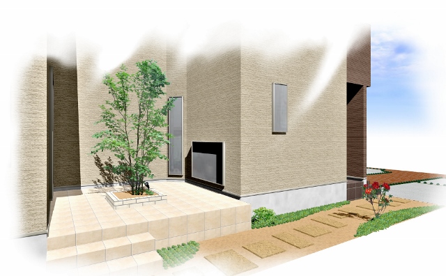 デザインコンクリートで玄関アプローチにアクセントをつけ、カーポート物置を設置する予定です。