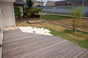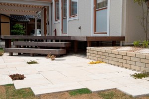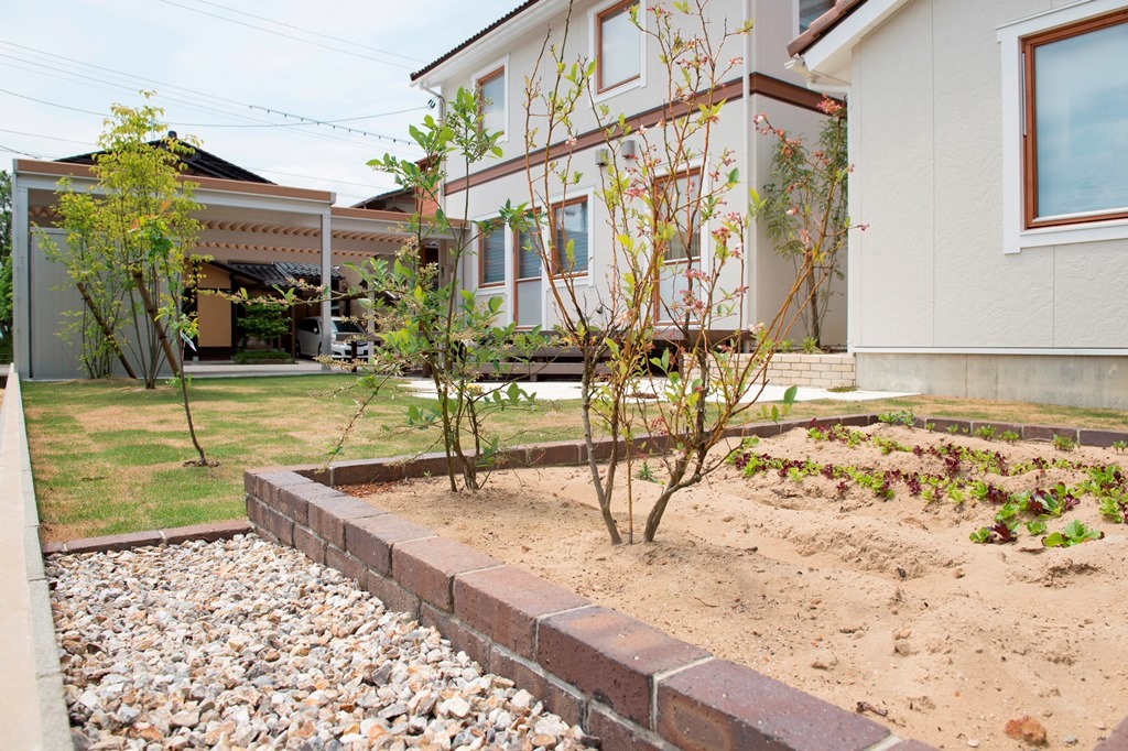 芝生、レンガなどやわらかい印象の材料で仕上げました。