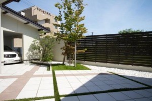 Y様邸は、タイルテラスの目地に、始めタマリュウを植えこんでありました。