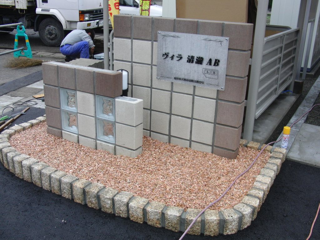 2014/01/14福井 福井市 おしゃれ モニュメント 集合住宅 こんにちは、リバーフォレスト プランナーの福原正洋です。 集合住宅モニュメントシリーズⅨ紹介いたします。 先日ご紹介したユニソンさんのキャトルクレイをデザインしてみました。 ツートンのキャトルクレイを大きさを変えて段違いに設置 間には照明をしのばせて夜にはガラスブロックは照らされ綺麗なシルエットになりました。