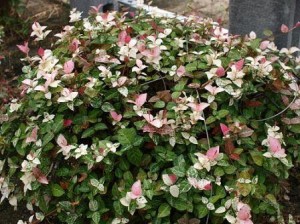 葉に白い斑が入りそこから「ハツユキ(初雪)カズラ」の名前がありますが、新芽のときには赤みの強い淡いピンク色で