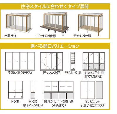 住宅スタイルに合わせて土間仕様・デッキON仕様・デッキIN仕様の3タイプから選択。