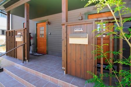 玄関ポーチを左右に分かれた2世帯住宅のため統一感を出すためにディーズガーデンの表札とポストを使い分かりやすく配置しました。