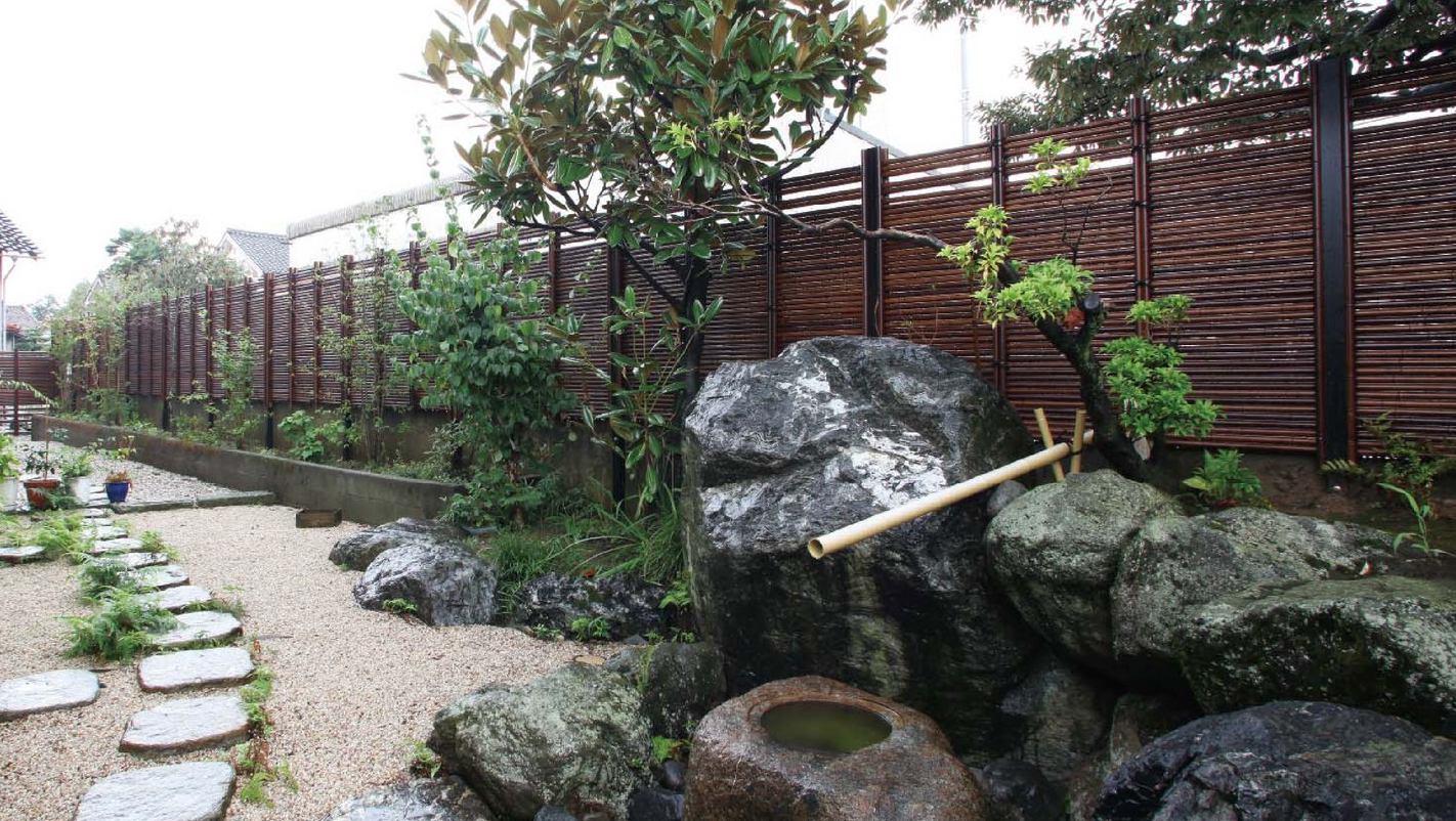 植栽を引き立てるシンプルな縦組の竹垣や、大空間にアクセントを添えるデザイン性に優れた竹垣、