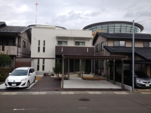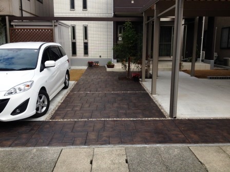 こちらです。アプローチは建物に合わせて、茶系のデザインコンクリート