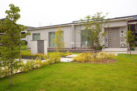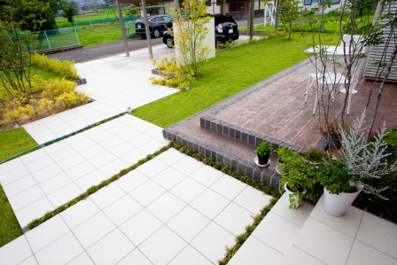 デザインコンクリートのテラス前は芝や植栽を植えて
