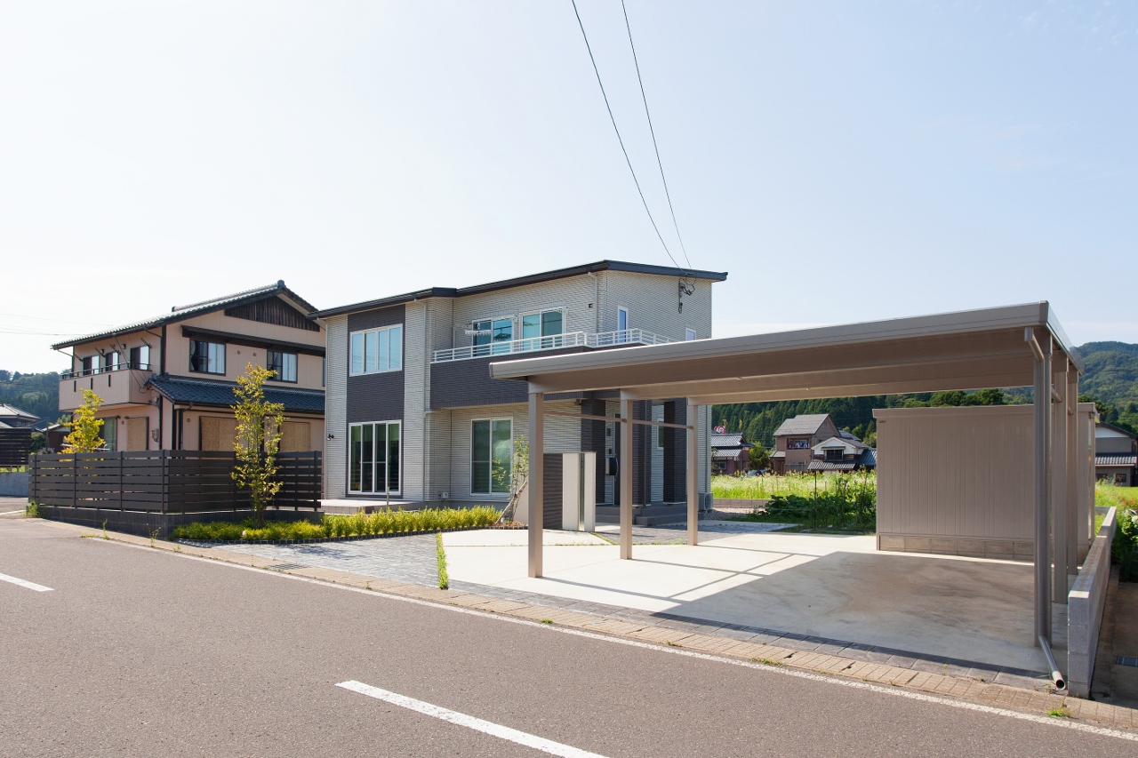 福井市 フェンス 木調 折板カーポート イナバ バイク保管庫 植栽 芝 福井