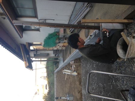 木調フェンス、B-ウッドフェンスの柱となる、角材を立てています。