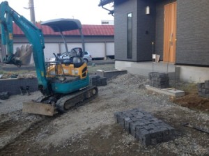 正面の化粧ブロック ユニソンのジャスティが途中まで積まれています。