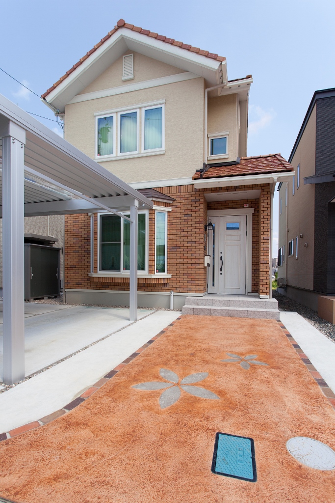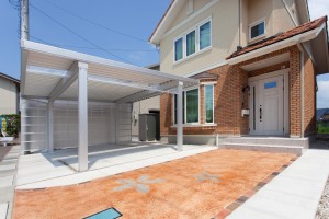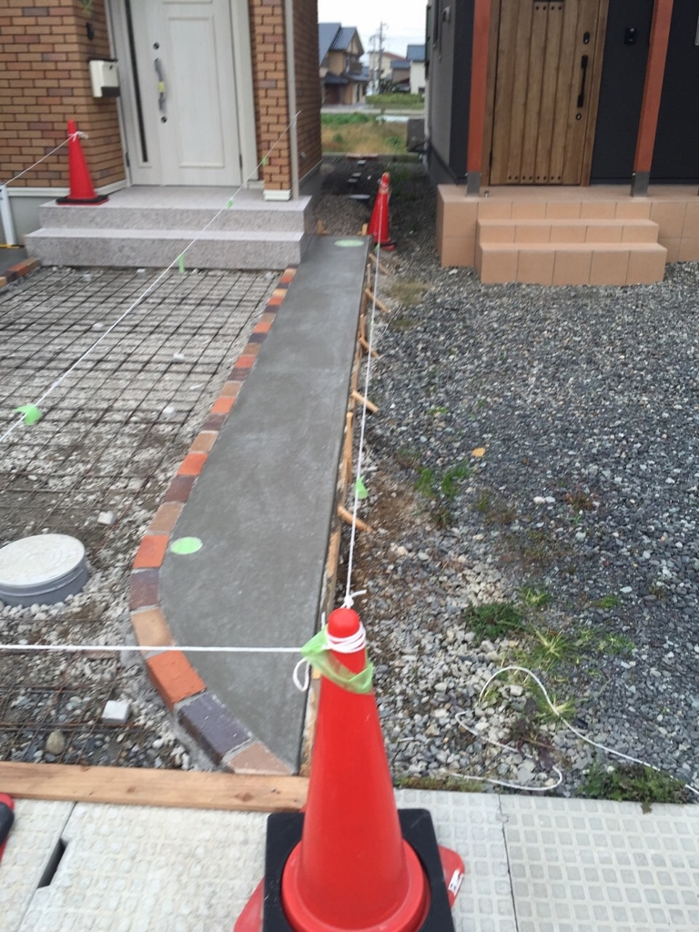 土間コンクリートとデザインコンクリートとの間のレンガは、