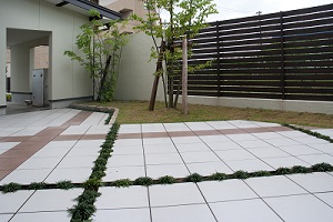 *300角タイルテラス・・・*目地にタマリュウ・・・*芝と株立ち高木・・・*目隠しフェンス