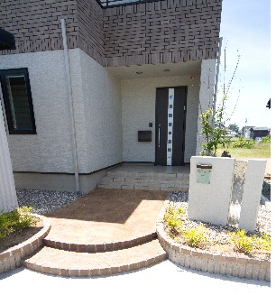 建物本体のポーチ前に追加した階段は、スタンプコンクリートとレンガ積であたたかい色合いです。