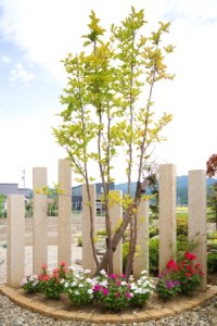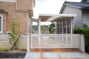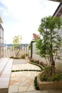 2014/04/15福井市 庭 外構工事 カーポート フェンス ピンコロ デザインコンクリート こんにちは、リバーフォレストまきです。 本日は前回に引き続きH様邸のご紹介です。 塗り壁のモニュメントに白を基調としたアルミ製品を施工し、 庭も白を中心に施工させて頂きました。 白のカーポートや白の木調フェンス、 そして、お庭に入ると、 ピンコロの花壇やタイルテラス、 デザインコンクリートを施工し、かわいらしいお庭の完成となりました!!