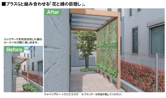 自然の採風目隠しフェンスや、日射しや照り返しを和らげる壁面緑化の効果が得られます。 ↓ ↓