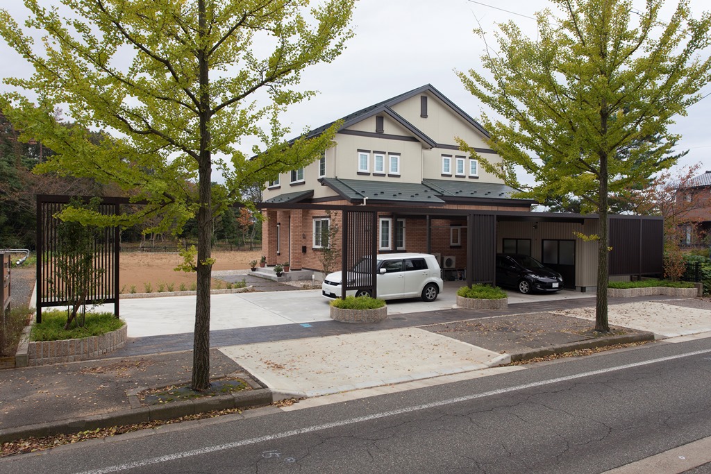 縦格子と花壇のアクセントをつけて、ただのゲートにではない、