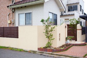 既存の土留めを利用して全体を塗り壁とディーズガーデンのアルファウッドフェンスで囲いました。