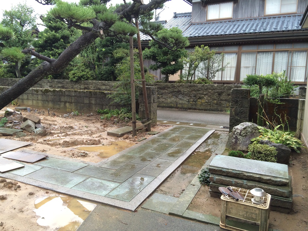 2015/09/03福井県 坂井市 外構工事 プラスG マットスタンプ ビーウッドフェンス タイルテラス こんにちは リバーフォレストのマダヨです。 今月は坂井市の新築外構の紹介をします。 今日はまず施工前の写真です。 こぶ出しに門柱が付いた趣のあるブロック塀です。 中から見ると門かぶりの立派な松の木があります。 この和風の外構を少しのこしつつ新築外構をします。 楽しみですね。