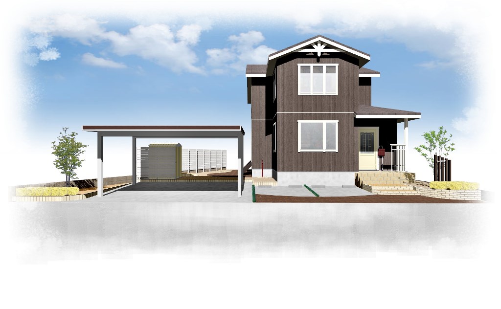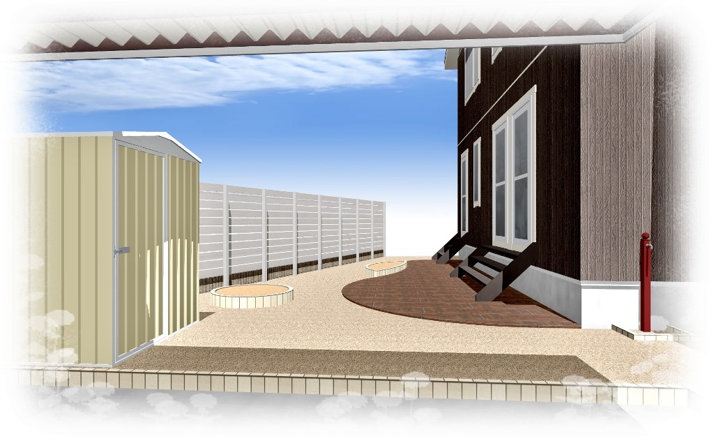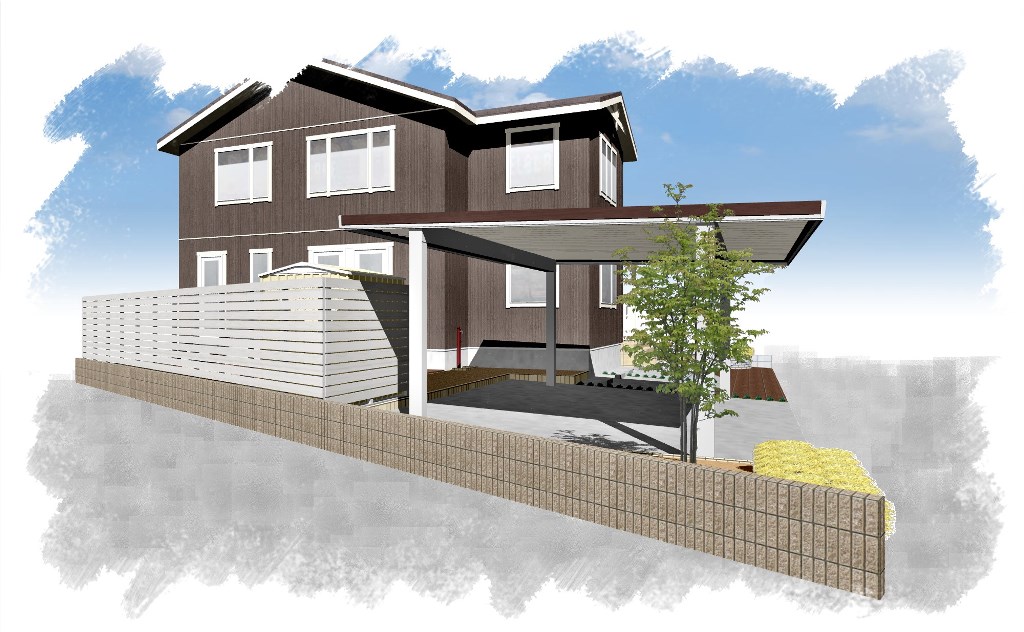建物の木目と窓枠の白を外構にも取り入れたプランです。