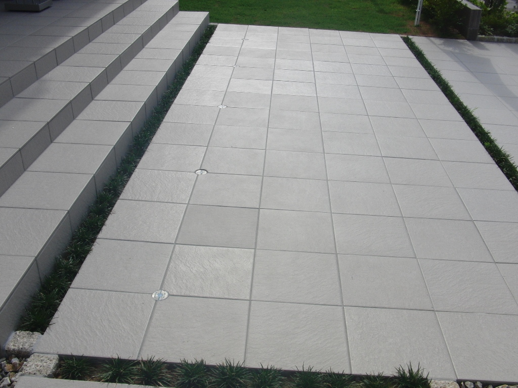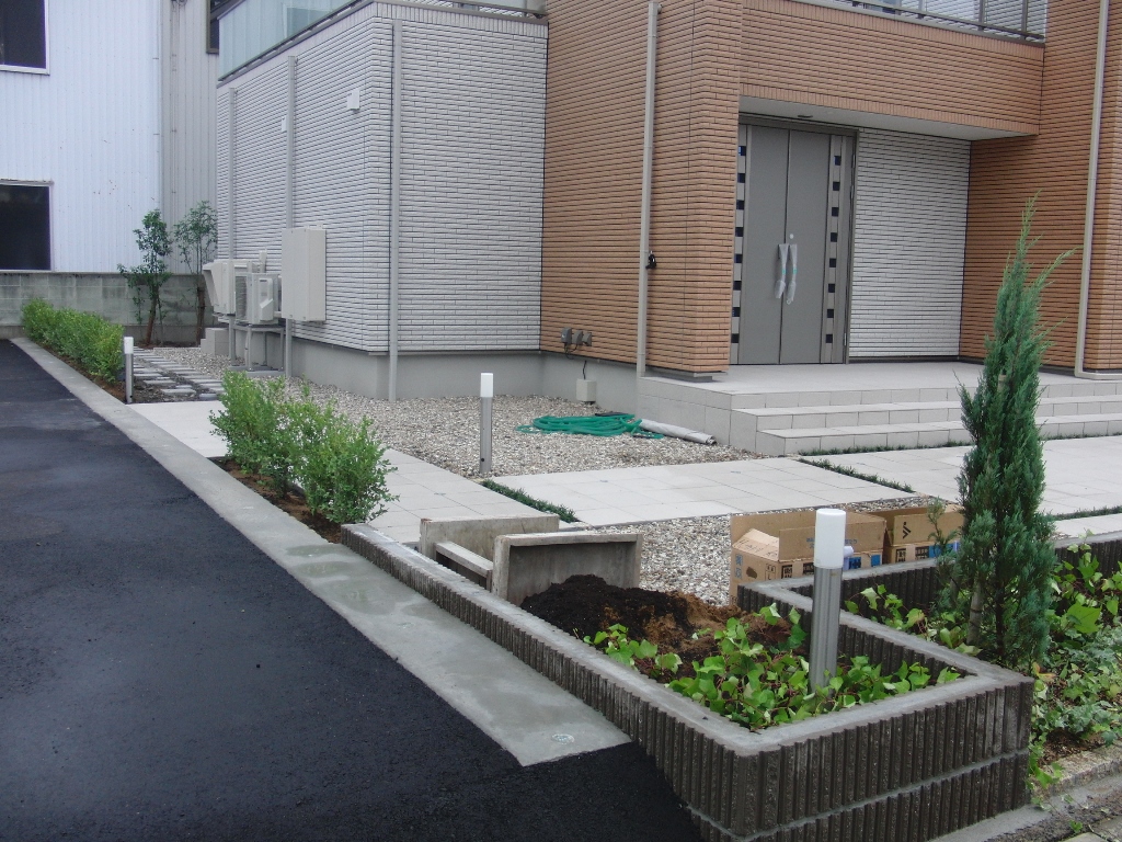 駐車場 の真ん中 、駐車場から アプローチ への 入口 、  玄関ポーチ の前に